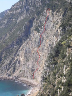 Este domingo após um ano a picar o João Pedro para ir à Arrábida fazer uma via aberta pelo Paulo Roxo na falésia do Píncaro - a maior falésia costeira de portugal continental, lá conseguimos nos juntar para o fazer . Decidimos ir no sábado ao final da tarde de modo a evitar o calor e fazer ainda o reconhecimento do inicio da via, com o objectivo de dormir aí e no dia seguinte escalar a via. Acabamos por dormir mais a Ardena (uma amiga) numa casa de pescadores situada no extremo norte da idílica baía onde se situa a falésia, no dia seguinte esperava-nos uma épica aventura que duraria 11h de escalada desde o início até ao fim dos rappéis. No domingo acordamos tarde e com uma grande ressaca devido a uma noite de festa ao ar livre para nos preparamos psicológicamente para o épico do dia seguinte, já com o pequeno almoço tomado e o material separado dirigimo-nos para a parede. Desde o primeiro largo de escalada aprecebemo-nos que o estado da rocha implicava um cuidado acrescido na forma como escalavamos e só as proteções fixas deixadas pelo Paulo Roxo nos deixavam um pouco mais calmos, pois nalguns largos posso afirmar só conseguimos pôr duas proteções devido à impossibilidade de proteger ou devido ao mau estado da rocha. No terceiro largo de escalada acabei por cair com um televisor na mão, e assustado com a precariedade da rocha ainda pensamos na reunião em abandonar, mas não, estavamos ali após tanto tempo que haviamos combinado esta escalada que decidimos continuar e superar as adversidades desta parede que a pouco e pouco se vai revelando cada vez mais intrigante e as semelhanças com o Eiger são curiosas, a travessia do 4º largo parece-se com a travessia Hinterstoisser e a rampa do 5º largo como o 1º neveiro da norte clássica, o diedro do 6º largo lembra a fissura difícil, e o 7º largo o pilar descomposto, no crux da via o João Pedro manda uma queda ao tentar descansar num entalador mal posto que acaba por saltar só parando num entalador fixo que o Paulo Roxo deixou martelado numa fina fissura, outro pormenor curioso e semelhante à norte clássica são algumas cordas fixas colocadas em alguns pontos onde a rocha é muito má; após uma ligeira travessia para a esquerda acabamos por atingir o topo da falésia rodeado de vegetação densa e pequenos arvoredos onde acabamos por descobrir uma corda passada numa árvore que é o rappel que acabamos por substituir com duas fitas tubulares e um mailot, após 8 rappéis já na escuridão da noite e muitos sustos com quedas de pedras (feri o ombro e uma mão, o joão feriu o pé) lá chegamos por fim à base da parede e com o nosso sonho concretizado apenas nos esperavam mais duas horas de caminhada para o carro.